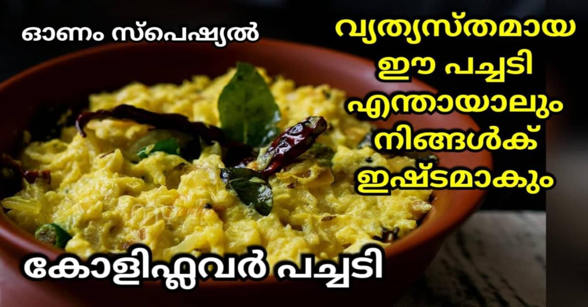 ഈ വരുന്ന ഓണത്തിന് എല്ലാവരും ഈ വ്യത്യസ്തമായ കോളിഫ്ലവർ പച്ചടി തയ്യാറാക്കി നോക്കണേ. വളരെ എളുപ്പമാണ് ഉണ്ടാക്കാൻ അതുകൂടാതെ നല്ല രുചിയും ഉണ്ട്. അപ്പൊ എല്ലാരും മറക്കാതെ വീഡിയോ കണ്ടു റെസിപ്പി ട്രൈ ചെയ്തു നോക്കൂട്ടോ.ഇത് കുട്ടികൾ മുതൽ മുതിർന്നവർ വരെയുള്ള എല്ലാവർക്കും വളരെയധികം ഇഷ്ടമാകും. തയ്യാറാക്കുന്നത് എങ്ങനെയെന്നു താഴെ കൊടുത്തിരിക്കുന്ന വീഡിയോയില് വിശദമായി കാണിച്ചു തരുന്നുണ്ട്.