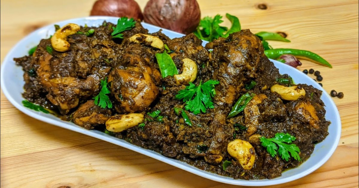 അതേ പാനിൽ 2 Tbsp വെളിച്ചെണ്ണ ഒഴിച്ച് ചൂടാക്കീട്ട് 4 tbsp ചതച്ച ഇഞ്ചി വെളുത്തുള്ളി ചേർത്ത് സ്വർണ്ണനിറമാകുന്നതുവരെ വഴറ്റുക. മസാല പേസ്റ്റും 1/2 കപ്പ് വെള്ളവും ചേർത്ത് 5-6 മിനുട്ട് വഴറ്റുക, dark brown നിറമാകുന്നതുവരെ. ഈ സമയത്ത് എണ്ണ തെളിയാൻ തുടങ്ങും. ഇനി 1 കിലോ ചിക്കൻ ചേർത്ത് ഇളക്കുക.ഉപ്പ് ക്രമീകരിക്കുക.ഇടത്തരം തീയിൽ വേവിക്കുക 10 minute ചിക്കൻ പാകമായി കഴിഞ്ഞാൽ ഗ്രേവി വറ്റു വരെ കുറഞ്ഞ തീയിൽ വരട്ടി എടുക്കുക മല്ലിയിലയും 3-4 പച്ചമുളകും 1 ടീസ്പൂൺ ഗരം മസാലയും ചേർക്കുക. ഇനി ചിക്കൻ പാത്രത്തിൻ്റ ഒരു വശത്തേയ്ക്ക് നീക്കി 1 Tbsp വെളിച്ചെണ്ണയും 1/2 ടീസ്പൂൺ കുരുമുളകും 6-8 കശുവണ്ടിയും 2 തണ്ട് കറിവേപ്പിലയും ചേർത്ത് വഴറ്റുക. അവസാനം 1/2 ടീസ്പൂൺ ജീരകം പൊടിയും 1/2 ടീസ്പൂൺ ഗരം മസാലയും മല്ലിയിലയും ചേർക്കുക ..കൊതിയൂറും കുരുമുളക് ഇട്ട് വരട്ടിയ ചിക്കൻ ഇപ്പോൾ തയ്യാറാണ് …