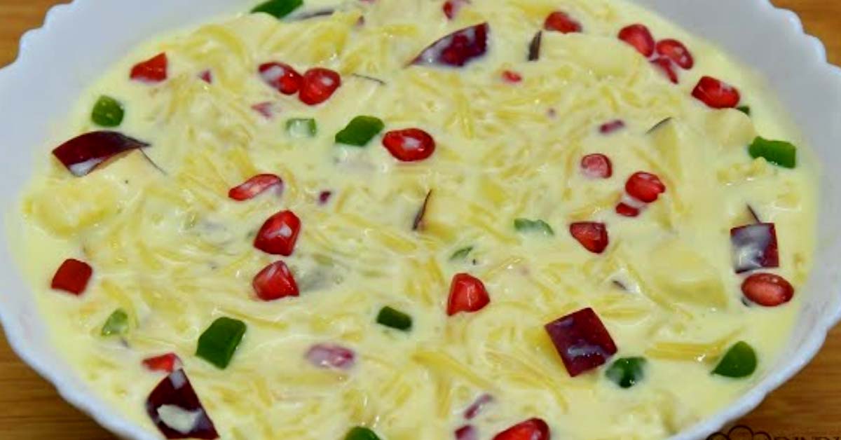 ആദ്യം പാൽ തിളപ്പിക്കാൻ ആയി ഒരു പാത്രത്തിലേക്ക് ഒഴിച്ചുകൊടുക്കണം, നന്നായി തിളച്ചുവരുമ്പോൾ അതിലേക്ക് സേമിയയും, കുങ്കുമപ്പൂവും ഒരുമിച്ചു ചേർത്ത് കൊടുക്കാം, നല്ലതുപോലെ വേവുന്നതുവരെ തിളപ്പിക്കണം, ശേഷം പഞ്ചസാരയും കൂടി ചേർത്തു കൊടുക്കാം, ഒരു ചെറിയ ബൗളിൽ കസ്റ്റാർഡ് പൗഡർ ഉം പാലും കൂടി മിക്സ് ചെയ്ത് തരികൾ എല്ലാം കളഞ്ഞതിനുശേഷം ഈ പാലിലേക്ക് ചേർത്തു കൊടുക്കാം.വീണ്ടും നന്നായി തിളപ്പിച്ച് കുറുകിയതിനു ശേഷം തീ ഓഫ് ചെയ്ത് ഒരു ബൗളിലേക്ക് മാറ്റാം, ഇതിലേക്ക് ചെറുതായി കട്ട് ചെയ്ത പഴം, ആപ്പിൾ, മാതളനാരങ്ങാ ,ടൂട്ടി ഫ്രൂട്ടി എന്നിവ ചേർത്ത് മിക്സ് ചെയ്യാം ശേഷം സെർവ് ചെയ്യാം.