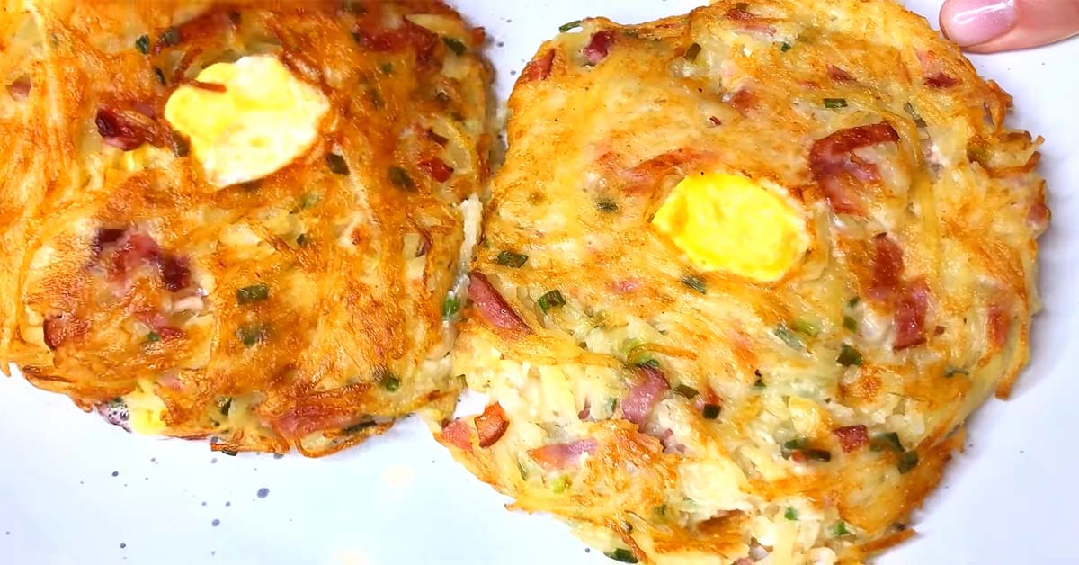 ഇതിനായി നാല് ഉരുളക്കിഴങ്ങ് തൊലി കളഞ്ഞതിനുശേഷം ഗ്രേറ്റ് ചെയ്തെടുക്കുക, നീളത്തിൽ ഉള്ള ചെറിയ കഷ്ണങ്ങൾ ആയാണ് എടുക്കേണ്ടത് , ഇത് കഴുകിയതിനുശേഷം വെള്ളം കളഞ്ഞു ഒരു ബൗളിൽ എടുക്കുക , ഇതിലേക്ക് ചെറുതായി അരിഞ്ഞ സ്പ്രിങ് ഒണിയൻ , ഒഹാം എന്നിവ ചേർത്തു കൊടുക്കാം, ശേഷം നാല് മുട്ടയുടെ വെള്ള കരു ചേർത്തുകൊടുക്കാം കൂടെ ആവശ്യത്തിന് ഉപ്പ്, പാപ്രിക പൗഡർ, മൈദ രണ്ട് ടേബിൾ സ്പൂൺ എന്നിവ ചേർത്ത് നന്നായി മിക്സ് ചെയ്യുക. ഒരു പാനിൽ എണ്ണ ഒഴിച്ച് ചൂടാക്കി ശേഷം ഈ മിക്സ് ചേർത്ത് കൊടുക്കാം, ചെറിയ റൗണ്ടിൽ പരത്തി കൊടുത്തു,നടുവിൽ ഹോൾ ഉണ്ടാക്കണം, ഈ ഹോളിലേക്ക് മഞ്ഞക്കരു ചേർത്തുകൊടുക്കാം, മുകളിലേക്ക് അല്പം കുരുമുളകുപൊടി ഇട്ടതിതിനുശേഷം രണ്ടു സൈഡും നന്നായി വേവിച്ചെടുക്കാം.