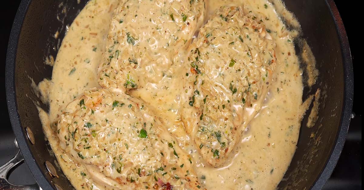 മൂന്ന് വലിയ ചിക്കൻ ബ്രേസ്റ് കഷണങ്ങൾ എടുത്ത് മുകൾവശം നന്നായി വരഞ്ഞു കൊടുക്കുക, ഒരു പാനിൽ 2 ടേബിൾ സ്പൂൺ ഒലിവ് ഓയിലും, ഒരു ടേബിൾ സ്പൂൺ ബട്ടറും ചേർത്ത് ചൂടാക്കണം, ഇതിലേക്ക് വരഞ്ഞ് എടുത്ത ചിക്കൻ പീസുകൾ ചേർത്ത് കൊടുക്കാം, മൂന്ന് നാല് മിനിട്ട് വരെ ഒരു വശം കുക്ക് ചെയ്യണം, മുകളിലേക്ക് അല്പം കുരുമുളകുപൊടി ഇട്ടു കൊടുത്ത് തിരിച്ചു ഇട്ടു കൊടുക്കാം, വീണ്ടും കുരുമുളകുപൊടി ചേർത്തു കൊടുക്കാം, രണ്ടു വശവും നന്നായി ഫ്രൈ ആയി വന്നാൽ പ്ലേറ്റിലേക്ക് മാറ്റിവയ്ക്കാം. വീണ്ടും പാനിലേക്ക് അല്പം ബട്ടർ ചേർത്ത് കൊടുത്തു ചൂടാക്കണം, ഇതിലേക്ക് പൊടിയായി അരിഞ്ഞെടുത്ത വെളുത്തുള്ളി ചേർത്ത് നന്നായി ഫ്രൈ ചെയ്യുക ശേഷം ഒരു സവാള പൊടിയായി അരിഞ്ഞത് ഇതിലേക്ക് ചേർക്കാം നന്നായി വഴന്നു വന്നാൽ ഇതിലേക്ക് അരക്കപ്പ് ബ്രോത്ത് വാട്ടർ ചേർക്കാം, കൂടെ പാഴ്സലി പൊടിയായി അരിഞ്ഞതും, ഒരു വലിയ നാരങ്ങയുടെ പകുതിയും ചേർക്കാം, അടുത്തതായി 170 മില്ലി വിപ്പിംഗ് ക്രീമും, അരടീസ്പൂൺ ജാതിക്ക പൊടിയും ചേർക്കാം ആവശ്യത്തിന് ഉപ്പ് കൂടി ചേർത്ത് നല്ലതുപോലെ തിളപ്പിക്കണം, ഇതിലേക്ക് ഫ്രൈ ചെയ്തു വെച്ച ചിക്കൻ കഷ്ണങ്ങൾ ചേർക്കാം ചിക്കൻ കഷണങ്ങൾ ഇതിൽ കിടന്നു നന്നായി തിളച്ചു വന്നാൽ തീ ഓഫ് ചെയ്യാം.
