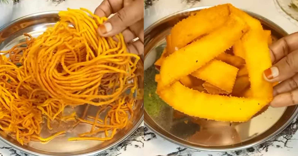 രണ്ടാമത്തെ സ്നാക്ക് തയ്യാറാക്കാനായി ചക്കച്ചുള ആദ്യത്തേത് പോലെ അടിച്ചെടുക്കാം, ഇതിലേക്ക് രണ്ട് കപ്പ് കടലമാവും അരക്കപ്പ് അരിപ്പൊടിയും ആവശ്യത്തിന് ഉപ്പ് ഒരു ടീ സ്പൂൺ മുളകുപൊടി കായപ്പൊടി മഞ്ഞൾപ്പൊടി വെളുത്തുള്ളിയും ചെറിയുള്ളിയും നന്നായി അരച്ചെടുത്ത് അതും കൂടി ചേർത്ത് നന്നായി കുഴച്ചെടുക്കുക, ചൂടാക്കിയ എണ്ണയും കൂടി ഒഴിച്ച് സോഫ്റ്റ് ആക്കാം, സേവനാഴിയിൽ നീളത്തിലുള്ള ഇട്ട് അതിനുശേഷം മാവുനിറയ്ക്കാം, ഇനി ചൂടായ എണ്ണയിലേക്ക് പിഴിഞ്ഞു കൊടുക്കാം, നന്നായി ഫ്രൈ ചെയ്തതിനുശേഷം കഷണങ്ങളാക്കി സൂക്ഷിക്കാം.