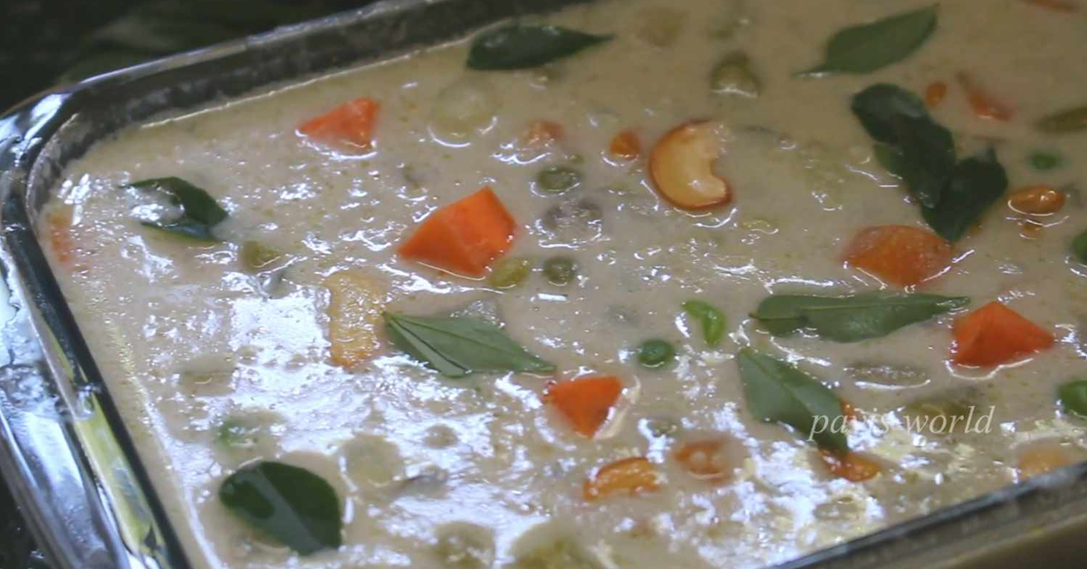 ഒരു കുക്കറിലേക്ക് കട്ട് ചെയ്ത് വെച്ചിരിക്കുന്ന പച്ചക്കറികൾ എല്ലാം ചേർക്കാം തേങ്ങയുടെ രണ്ടാം പാൽ ഇതിലേക്ക് ഒഴിച്ചു കൊടുക്കാം കൂടെ ഒരു കഷണം കറുവപ്പട്ടയും കുരുമുളക് ചതച്ചതും ഏലക്കായും ചേർക്കാം ആവശ്യത്തിന് ഉപ്പും കുറച്ചു കറിവേപ്പിലയും ചേർത്ത് ഇത് വേവിച്ചെടുക്കുക വെന്തതിനുശേഷം ഒരു പാനിലേക്ക് മാറ്റാം കൂടെ കശുവണ്ടി പേസ്റ്റ് ചേർത്തതിനുശേഷം നന്നായി തിളപ്പിക്കാം അവസാനമായി കട്ടിയുള്ള തേങ്ങാപ്പാൽ ചേർത്ത് ചൂടാക്കാം, തീ ഓഫ് ചെയ്തതിനുശേഷം നെയ്യിൽ കശുവണ്ടി വറുത്ത് ചേർക്കാം