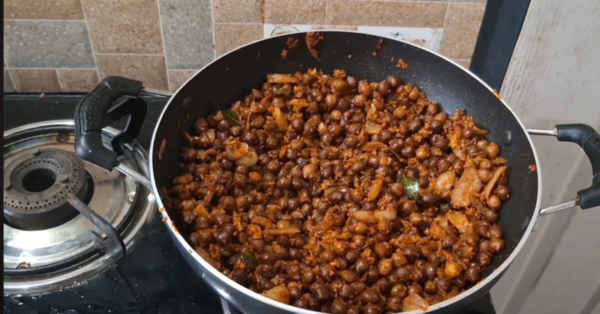 കുതിർത്തെടുത്ത കടല ഉപ്പുംവെള്ളവും ചേർത്ത് വേവിച്ചെടുക്കുക വെളിച്ചെണ്ണ ഒരു കടായിയിൽ ചൂടാവാനായി വെക്കാം , ഇതിലേക്ക് സവാളയും കറിവേപ്പിലയും ചേർത്ത് വഴറ്റുക ശേഷം തേങ്ങാ ചിരവിയത് ചേർക്കാം നല്ലതുപോലെ വഴറ്റിയതിനുശേഷം മസാല പൊടികൾ ചേർക്കാം പച്ചമണം മാറുന്ന വരെ മിക്സ് ചെയ്തതിനു ശേഷം കടല ചേർക്കാം ഇനി നല്ലതുപോലെ മസാല പിടിക്കാനായി മിക്സ് ചെയ്യാം ചെറിയ തീയിൽ മൂടിവെച്ച് കുറച്ചു സമയം വയ്ക്കുക ഇനി തീ ഓഫ് ചെയ്യാം