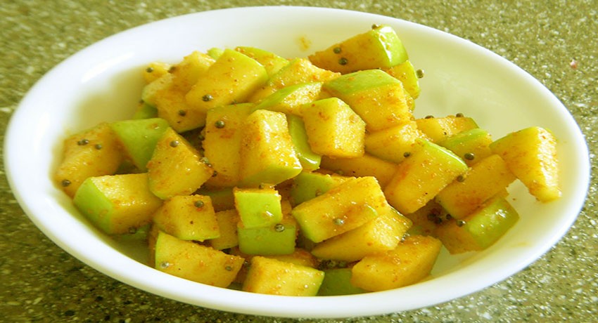 ചീനച്ചട്ടിയിൽ എണ്ണ ചൂടാക്കിയശേഷം ഇഞ്ചി, വെളുത്തുള്ളി, പച്ചമുളക് എന്നിവ വഴറ്റി കോരിയെടുക്കുക. അതിൽതന്നെ ഉലുവ, കടുക് പൊട്ടിച്ച് തീഅണച്ചശേഷം കായപ്പൊടി, മുളകുപൊടി, മഞ്ഞൾപ്പൊടി എന്നിവ ചേർത്ത് നന്നായി ഇളക്കുക. വീണ്ടുംചെറുതീയിൽവെച്ച് പാകത്തിന് ഉപ്പുനീരും വിനാഗിരിയും അരിഞ്ഞുവെച്ചിരിക്കുന്ന ആപ്പിൾ കഷണങ്ങളുംഇട്ട് അല്പനേരം ഇളക്കിയശേഷം വാങ്ങുക. ആറി