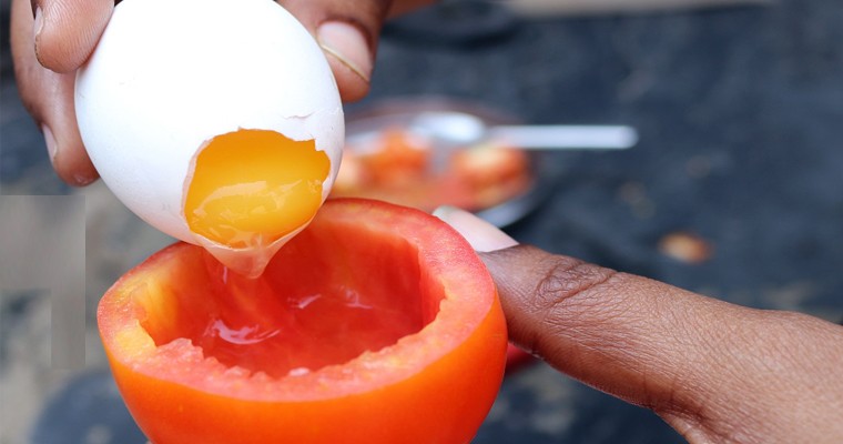 ഉരുളക്കിഴങ്ങ് പുഴുങ്ങിപ്പൊടിച്ചത് -50 ഗ്രാം, മസാലപ്പൊടി -1 ടീസ്പൂണ് ഉള്ളി -20 എണ്ണം, പച്ചമുളക് ആവശ്യത്തിന് തക്കാളി അരിഞ്ഞത് -ഒന്ന്, ഇഞ്ചി -2 ചെറിയ കഷണം.പാചകം ചെയ്യേണ്ട വിധം മുട്ട പൊട്ടിച്ച് ഉള്ളി ചെറുതായി അരിഞ്ഞത്, പച്ചമുളക് ചെറുതായി അരിഞ്ഞത്, ഇഞ്ചി കൊത്തിയരിഞ്ഞത്, ക്യാരറ്റ്, തക്കാളി അരിഞ്ഞത്, ഉരുളക്കിഴങ്ങ്, മസാലപ്പൊടി എന്നിവയും ആവശ്യത്തിന് ഉപ്പും ചേര്ത്ത് നന്നായി കൂട്ടി കലര്ത്തണം.ഇത് അടുപ്പത്ത് ചൂടായ കല്ലില് ഒഴിച്ച് പൊരിച്ചെടുത്ത് വിളമ്പാം.ഇത് പോലെ തക്കാളിക്ക് ഉള്ളിൽ വെച്ച് ഒരു ഓംലറ്റ് എങ്ങനെ തയ്യാറാക്കാം എന്ന് കാണാം