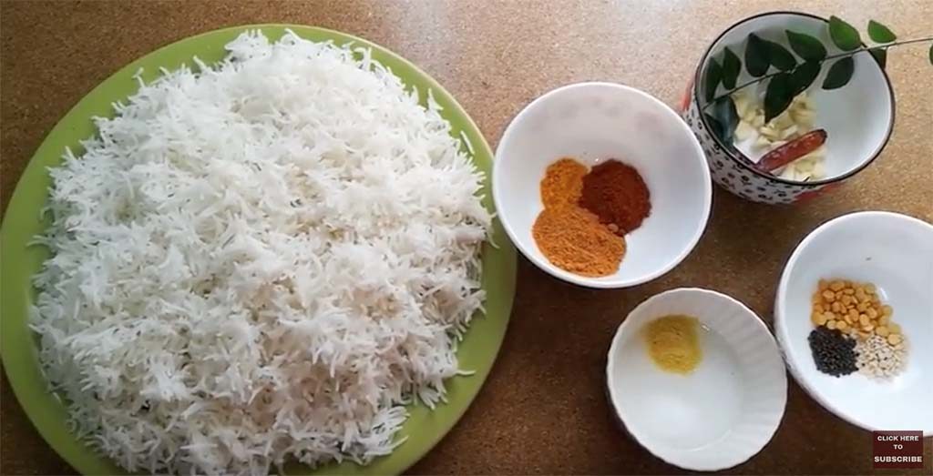 ഒരു പാനില്‍ ഓയില്‍ ഒഴിച്ച് ചൂടായി വരുമ്പോള്‍ അതിലേക്കു കടുക് ചേര്‍ത്ത് പൊട്ടിവരുമ്പോള്‍,കടലപരിപ്പും,ഉഴുന്ന് പരിപ്പും ഇട്ടു മൂപ്പിചെടുക്കണം. ഇതിലേക്ക് ഉണക്ക മുളകും ,കറിവേപ്പില,വെളുത്തുള്ളി എന്നിവ ചേര്‍ത്ത്മൂ പ്പിചെടുക്കണം.ഇതിലേക്ക് മുളക് പൊടി,മഞ്ഞള്‍ പൊടി,സാമ്പാര്‍ പൊടി എന്നിവ ചേര്‍ക്കണം.ഇതിലേക്ക് വേവിച്ച ചോറും ഉപ്പും,കായപ്പൊടിയും ചേര്‍ത്ത് നന്നായി മിക്സ്‌ ചെയ്തു ഒന്ന് രണ്ടു മിനിറ്റ് കൂടി ലോ ഫ്ലെയിമില്‍ റോസ്റ്റ് ചെയ്ത ശേഷം അടുപ്പില്‍ നിന്നും മാറ്റി,ഇഷ്ടമുള്ള കറിയുടെ കൂടെ സെര്‍വ് ചെയ്യാവുന്നതാണ്.