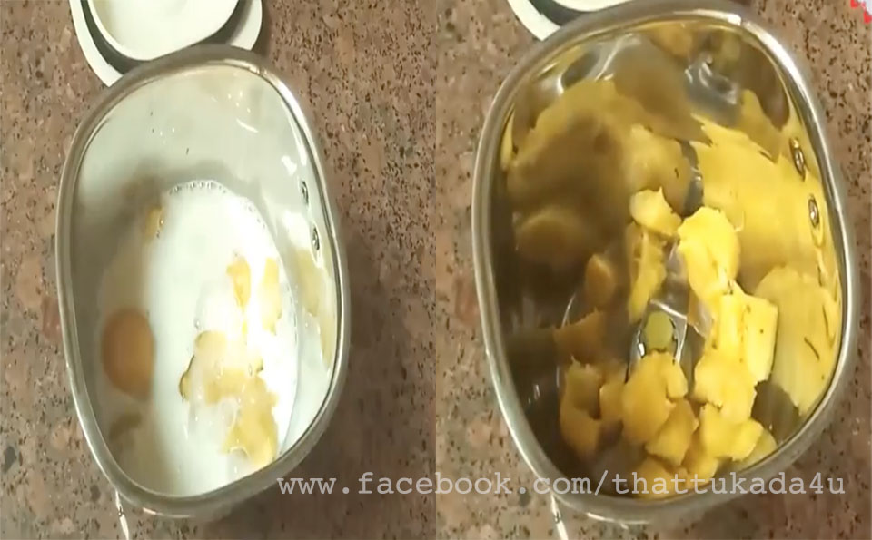 ഏത്തപ്പഴം പുഴുങ്ങിയത് ചെറുതായി മുറിച്ച് മിക്സിയിലിടുക ,മുട്ട പാൽ ,പഞ്ചസാര കൂടി ഇട്ട് നന്നായി അരച്ചെടുക്കുക. ഇത് ഒരു പാത്രത്തിലേക്ക് മാറ്റുക. ഇതിൻറ് കൂടെ ഗോതബുപൊടി,വെള്ളം ,ഉപ്പ് ചേർത്ത് ദോശ മാവിൻറ് പാകത്തിന് കുഴച്ചെടുക്കുക.