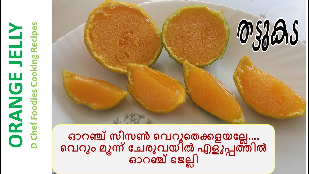 ഓറഞ്ച് ജെല്ലി വെറും മൂന്നു ഇൻഗ്രീഡിയൻറ്സ് മാത്രം മതി ഇത് എല്ലാവർക്കും ഇഷ്ടമാകും. തയ്യാറാക്കുന്നത് എങ്ങനെയെന്നു താഴെ കൊടുത്തിരിക്കുന്ന വീഡിയോയില്‍ വിശദമായി കാണിച്ചു തരുന്നുണ്ട്. വീഡിയോ നോക്കി നിങ്ങളും ഓറഞ്ച് ജെല്ലി ഉണ്ടാക്കി നോക്കൂ. മറ്റുള്ളവര്‍ക്കു കൂടി ഈ പോസ്റ്റ്‌ ഷെയര്‍ ചെയ്യാന്‍ മറക്കരുത്. വ്യത്യസ്തങ്ങളായ രുചികൂട്ടുകള്‍ ദിവസവും ലഭിക്കുന്നതിനു ഞങ്ങളുടെ ഫെയിസ്ബുക്ക് പേജ് ലൈക്ക് ചെയ്ത ശേഷം Following എന്നതില്‍ See First എന്നതും ആക്കുക. കൂടുതല്‍ വീഡിയോകള്‍ക്കായി D Chef Foodies Cooking Recipes ചാനല്‍ Subscribe ചെയ്യൂ.
